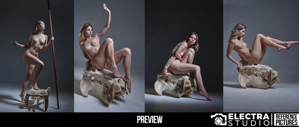 This pack includes over 1600 images featuring a wide range of poses: strong stances, elegant motion, weapon variations (axes, spear, staff), rope poses, sitting and standing sequences, silhouette studies, and atmospheric shots on a giant skull prop. Each setup offers clear shapes, clean anatomy visibility, and diverse angles to support realistic figure drawing and character development.